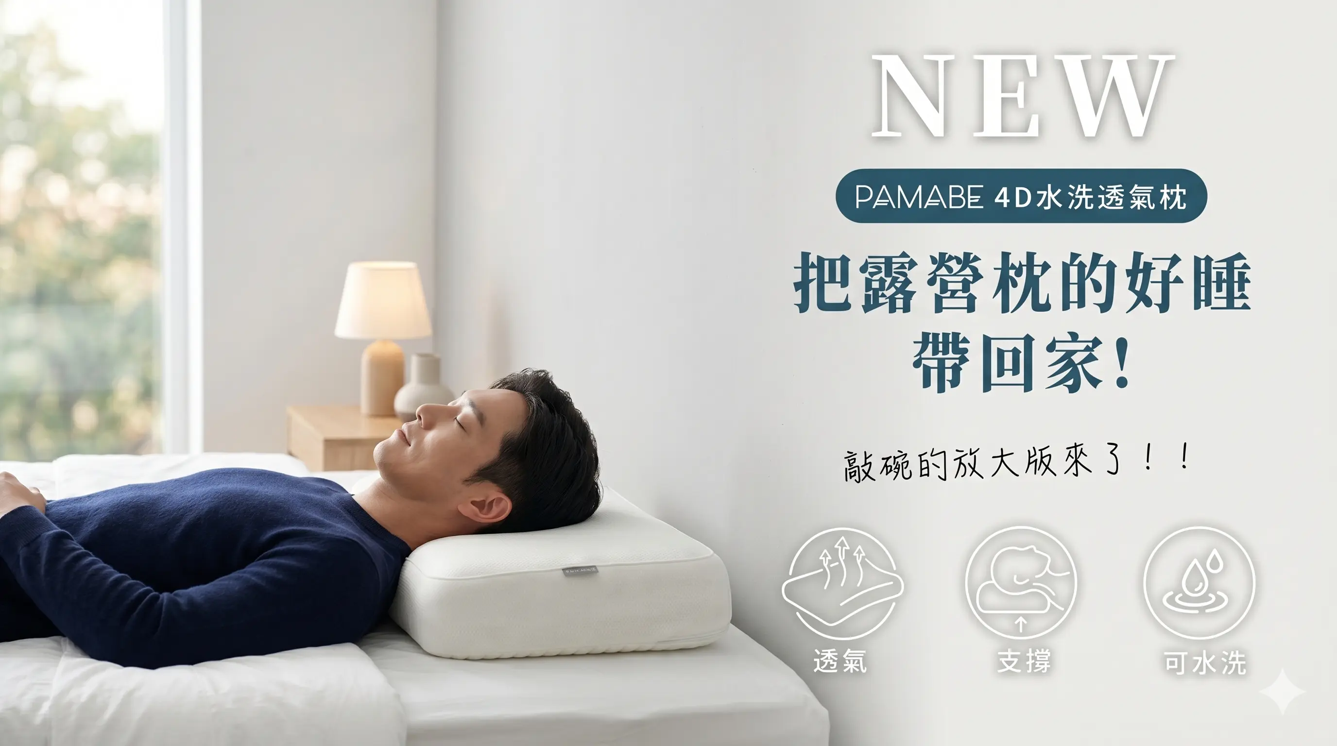 在追求極致睡眠品質的路上,枕頭的核心材質決定了對頸椎的保護程度。PAMABE 將多年來在戶外露營領域積累的高評價支撐技術,完整導入居家環境,推出 PAMABE 4D 水洗透氣枕。本產品一樣是選用 POE 高分子彈性體 內芯,以卓越的物理特性解決了傳統枕頭容易悶熱、塌陷及滋生過敏原的痛點,為現代居家打造深層睡眠的新標竿。